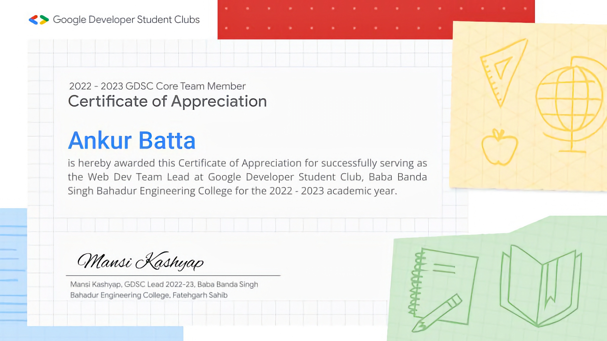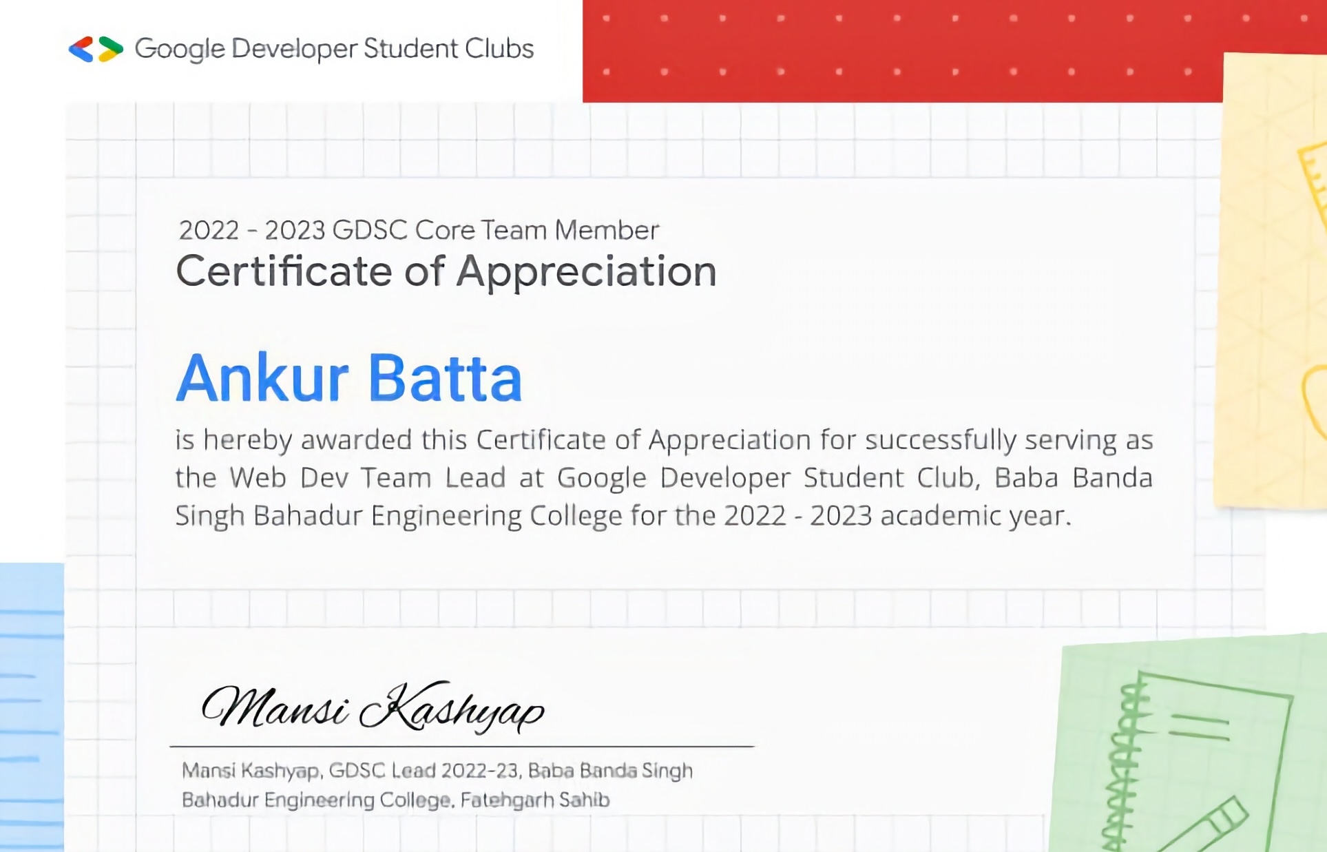 I have achieved many certifications during my degree and I had also been the leader of Google DSC Web Dev Team of my college.